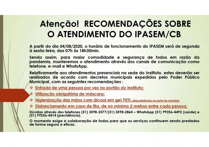 Atenção! RECOMENDAÇÕES SOBRE O ATENDIMENTO DO IPASEM/CB