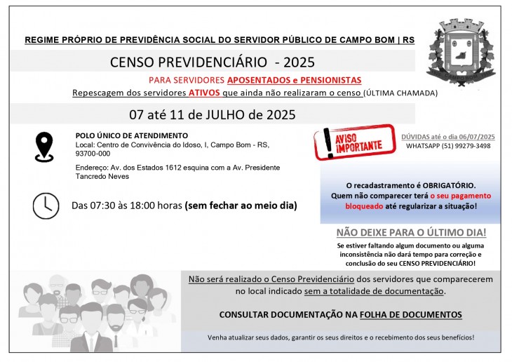Foi publicado pelo Poder Executivo Municipal o Decreto nº 7.767/2025, no qual fica estabelecida a obrigatoriedade dos servidores inativos e pensionistas, de todas as eferas municipais, a comparecer entre os dias 07 a 11 de julho de 2025, no horário compreendido entre 07:30 até 18:00 (sem fechar ao meio dia), para a realização do censo cadastral previdenciário.Conforme consta no decreto, o servidor deverá preencher a ficha cadastral e comparecer no polo de sua preferência para entrega dos documentos, atendimento e entrevista, nos dias e horários acima descritos: